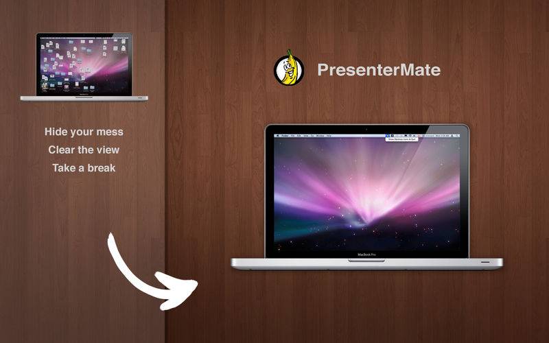 When you open the application, PresenterMate puts an icon in the right side of your menu bar, and all the icons of folders, files, pages, pictures and anything else that might have cluttered your desktop, it all disappears from view. Close the application by clicking a button in the menu bar and all the icons come back.