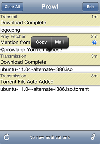 每一款支持Growl的软件其模式都不尽相同,比如:OS X自带的Mail,必须装有GrowlMail才能支持Growl,Mail是我在Prowl中必绑的一个软件。