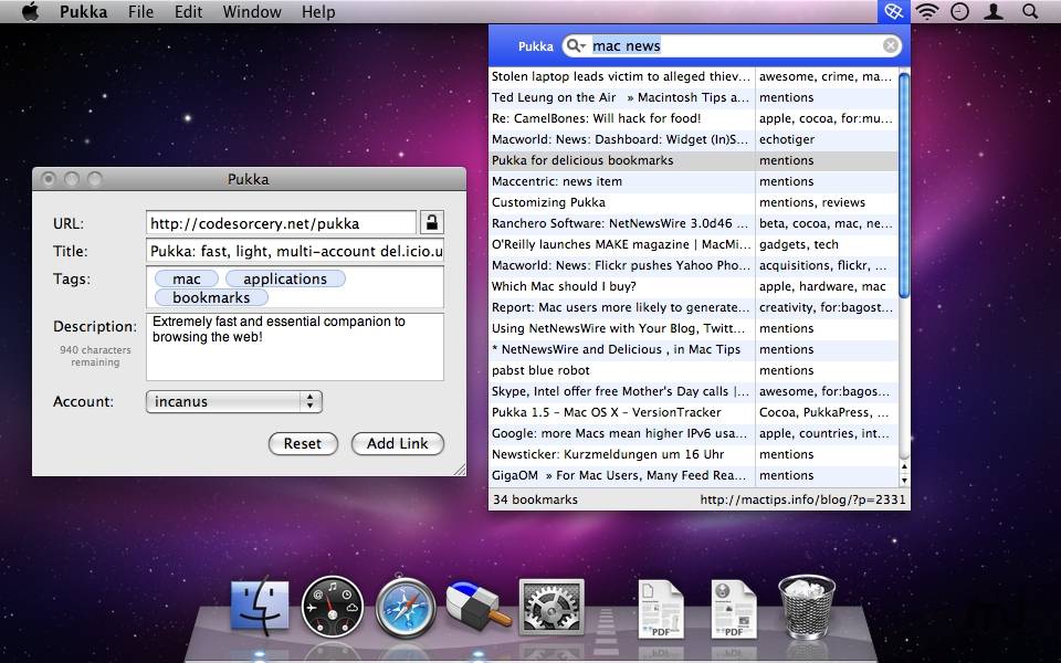 Pukka is a richly-featured client for Delicious, Ma.gnolia, and compatible social bookmarking services with integrated fast search. Fire it up and within seconds you can easily post to one or more accounts. Pukka comes with its own bookmarklet for super fast posting, or you can drag a URL from any browser, open a URL shortcut file on the desktop, or drag a URL right onto the dock icon. You can even set Pukka as your external weblog client in NetNewsWire, NewsFire, and Vienna. No more waiting for the posting page to load, no more bulky bookmark organizers when all you want to do right now is post a link. Pukka moves in fast and then gets out of the way so that you can keep browsing. Features: Speed: Fast, light, and always ready. Bookmark Search: Fast and keyboard navigable. Tag Menus: Fast access to your bookmarks by tag in the dock and/or menu bar. Security: Uses SSL and the Mac keychain and allows private posting. Keyboard Shortcuts: Keep your eyes on the screen and your hands on the keyboard. Growl: Keep distractions to a minimum but stay notified with Growl. RSS Integration: Integrates with popular readers like NetNewsWire, NewsFire, and Vienna. Multiple Accounts: The first and most popular multi-account posting client. Tag Completion: Tag completion across accounts as you type. Scriptable: AppleScript-aware for fast workflow integration. Browser Integration: Bookmarklet for integration with Safari, Firefox, Camino, OmniWeb, and more. Mac Style: Simple, elegant, and with all the trimmings: Bonjour, Spotlight, Sparkle, and more.