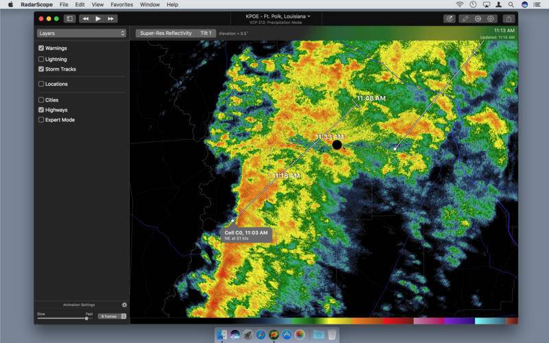 RadarScope is a specialized display utility for weather enthusiasts and meteorologists that allows you to view NEXRAD Level 3 radar data and severe weather warnings. It can display the latest reflectivity, velocity, and other radar products from any NEXRAD radar site in the United States, Guam, or Puerto Rico. These aren't smoothed PNG or GIF images, this is real Level 3 radar data rendered in its original radial format for a high level of detail. Whether you are scanning reflectivity for a mesocyclone's tell-tale hook echo, trying to pinpoint the landfall of a hurricane's eye wall, or looking for small features like velocity couplets in the storm-relative radial-velocity product, RadarScope gives you the power to view true radial NEXRAD weather radar on your Mac. RadarScope displays tornado, severe thunderstorm, and flash flood warnings issued by the National Weather Service. You can browse the list of active warnings in the information sidebar, select a warning to view the details, and even zoom to the selected warning on the map. Zoom in and out on the map using the mouse or pinch gestures on multi-touch trackpads. Click and drag to scroll around the map. Select one of the 155 different radar sites using buttons on the map, the full radar list in the sidebar, or your list of saved favorites in the menu bar. Tap the play button to download and animate up to 20 frames of radar data. Dynamically display the names of over 25,000 cities and towns on the map as you zoom and scroll. Move the cursor over the color legend to see the data value associated with each color. You can also copy the currently displayed map to the clipboard or save it in several common image formats. Meanwhile, RadarScope will retrieve and display updated data automatically and intelligently (approximately every 5 to 10 minutes, depending on the radar scan strategy). Note: This application contains in-app and/or external module purchases.