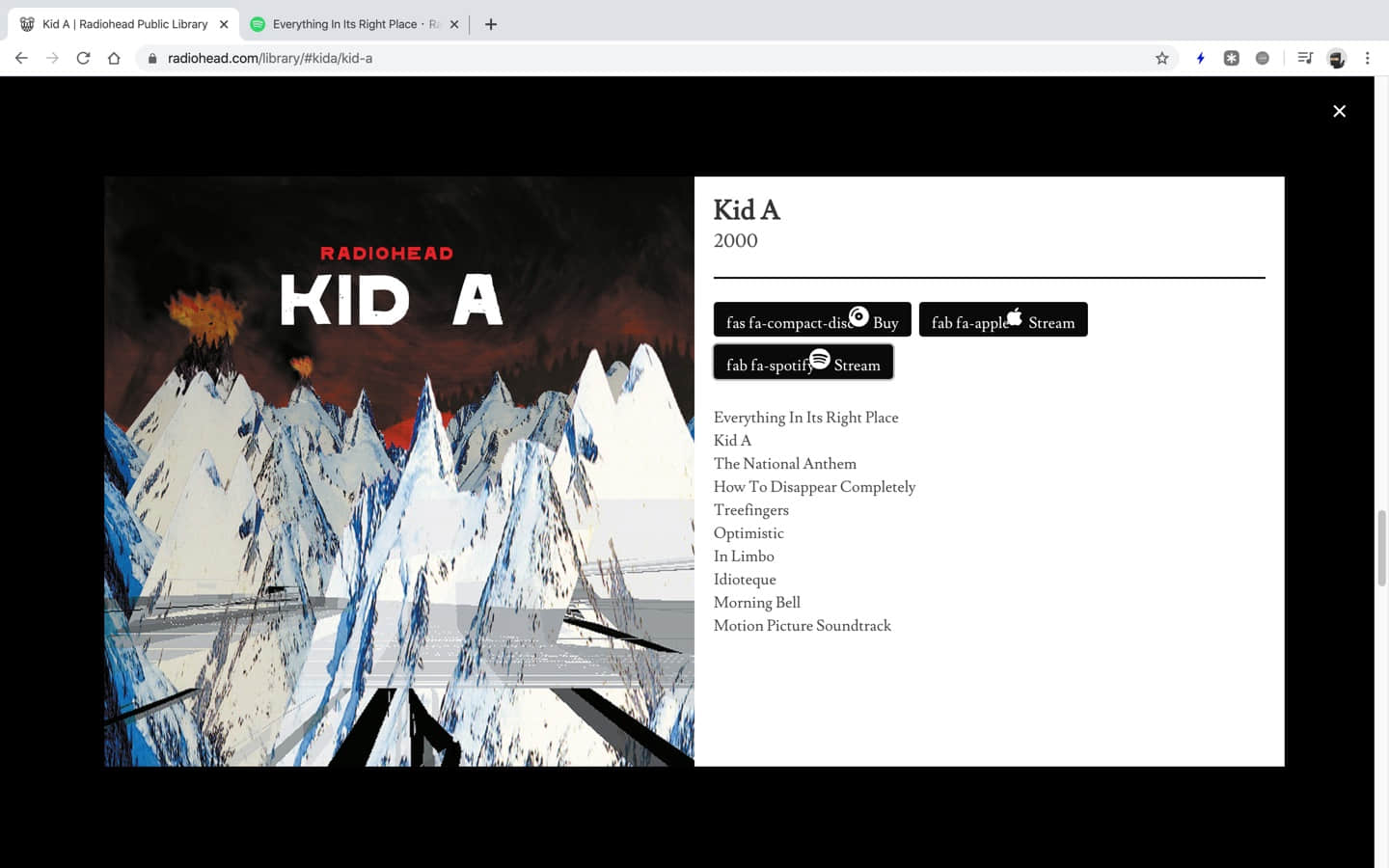 Radiohead 于 2020 新年在其官方网站发布了其公共资料馆,乐队所有的正式专辑、单曲、MV、现场表演视频、未发布的单曲小样以及官方纪念品购买链接均出现在资料馆,这些音视频资料仅可在线欣赏(通过 iTunes、Spotify),但不支持下载。