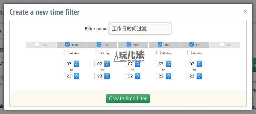 这是我们要介绍的最后一个高级功能,“Advanced Filters”,这里包括一个 “Time Filters” 和一个 “Keywords Filters”,利用时段或关键词过滤你可以在任何事件报告、目标或提醒中指定具体的事件统计数据。比如我想建立一个 “工作日时间过滤”,那可以取消勾选周末两天的统计工作,然后在 5 个工作日上设定作息时间段,这个时间段每天都可以不一样,根据你的习惯设定即可。