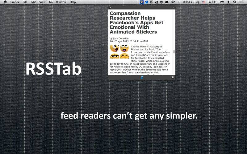 RSSTab is a feed reader/aggregator for your MenuBar. Follow articles and stay updated on blogs/websites you like, all from your menubar.