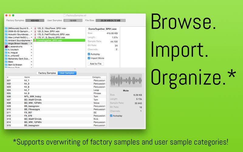 - easily browse for wav and aif files on your harddisk and mounted devices