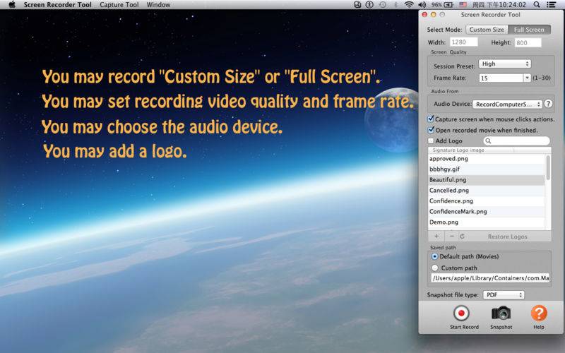 Screen Recorder Tool Lite is a lite version of Screen Recorder Tool. Screen Recorder Tool is a very useful tool. You can record the screen as high quality videos. It support audio record and add your logo or signature. You may Set video quality and choose audio device by your request. What you see is what you get. If you have any suggestion, tell me(billyonng@gmail.com). We will do it better. If you like it, please give me Ratings & Reviews.