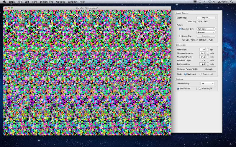Sirds lets you create Single Image Random Dot Stereogram (SIRDS) and Single Image Stereogram (SIS) images.
