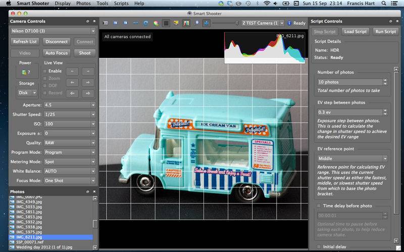 Smart Shooter allows you to fully control your camera from your Mac, giving you freedom to explore and experiment to help take the perfect picture. Automatic download and display means you can fully evaluate your photos in seconds, and real time live view output will help you focus and compose the scene. Scripting language lets you control your camera, allowing you to take multiple photos with varying settings just by clicking a single button.