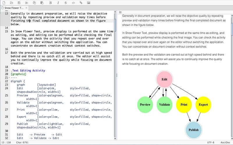 “Snow Flower Text”是用于文档编写和编程的文本编辑器。 轻量级标记可用于文档创建,并可导出为HTML,PDF,EPUB,DocBook。