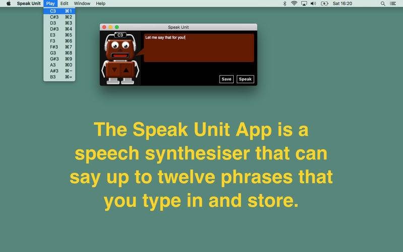 Speak Unit is a speech synthesiser audio extension for use in Garageband and other compatible music software. You enter up to twelve phrases that are each triggered by a unique note.