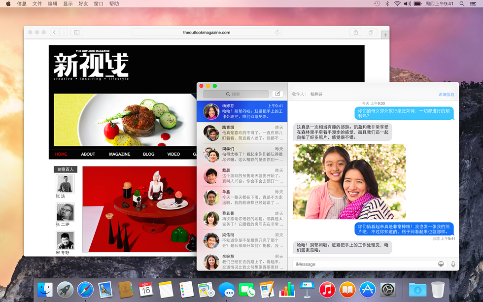 OS X Yosemite 对 UI 设计进行了大胆的革新,将桌面级用户体验和 iOS 的 Flat Style 完美的结合在了一起,一些特点界面元素,比如 Menubar,浏览器工具栏等均改为透明化和毛玻璃特效处理,你在滚动查看窗口时,可以看到窗口显示内容之外的更多内容,界面可以同时呈现你的桌面图像以及你的内容,增强了整体立体感。