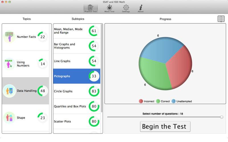 This app covers 43 topics. Each topic has quick revision notes. Questions are similar to the ones asked in SSAT or ISEE tests. They vary in difficulty levels ranging from 1 to 10.
