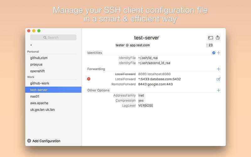 SSH Config Editor is a handy tool for manage your OpenSSH ssh client configuration file. You can add or edit identity files, port forwardings (with handy graphical preview) and any other ssh config option. Features Add/change identity files by choosing them in file dialog Add/edit port forwarding options with graphical help Add/edit any supported ssh option with help RSA key pair generation Separators for grouping host configurations Ability to disable each single config option Action to generate command for ssh copy id Open connection to server