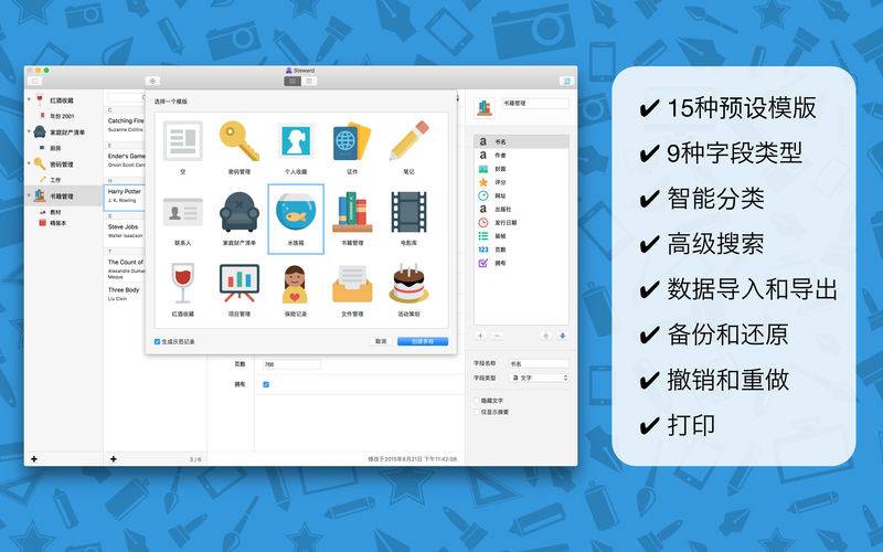 +++ 中国制造 +++ Steward是一个管理信息的个人数据库。可以用来管理密码,笔记,个人收藏等等。 • 10多种预定义模版(密码,个人收藏,笔记,文档等等) • 9种字段类型 (文字,数字,图片,日期,附件,评分,勾选框,多选框,网站) • 智能分类 • 高级搜索 • 数据导入和导出CSV,TAB • 数据备份和还原 • 撤销和重做 • 打印 • 可以自定义表格图标也可以从自带图标库种选择 • Quicklook图片和附件 免费版允许创建5个表格,每个表格可以包括5条记录