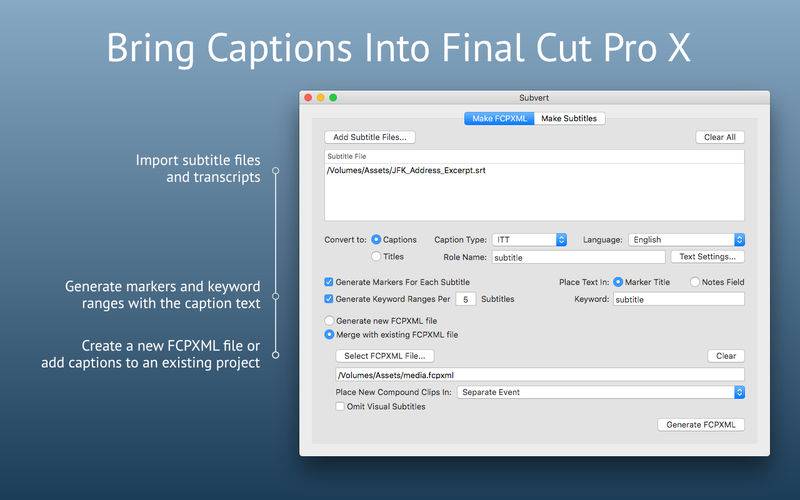 Subvert expands on Final Cut Pro X's captioning capabilities. It makes editing with captioned source footage easy. It's perfect for speeding up documentary and foreign-language video post-production workflows.