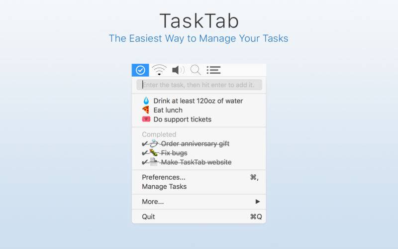 TaskTab places the focus squarely on your to do list. We've intentionally kept the app as simple as possible to allow you to quickly add, check off and manage your tasks without being distracted by pointless features that overly complicate the key purpose of a to do list app. The app lives in your menubar and is available at a click of a button or via its customizable hot key.