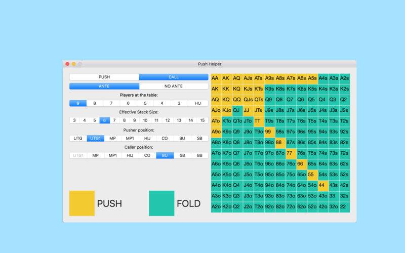 The Push Helper app is based on the Nash equilibrium and shows all of the profitable push or call ranges.