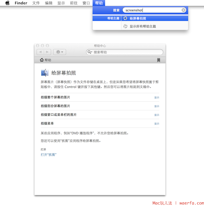 如需其他帮助,请在 Finder - 菜单栏 - 帮助 - 搜索框中输入 “screenshot” 即可获取相关指导。