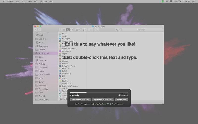 You deserve a break. Easy break reminders, with flexible customization if you want it.