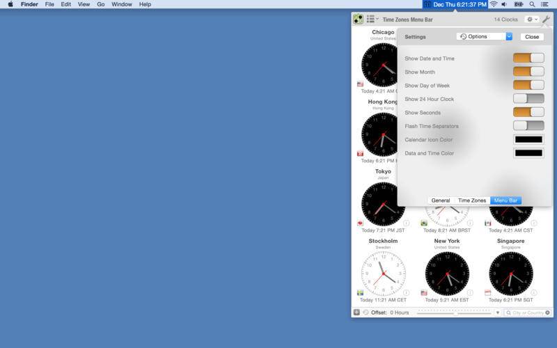 Time Zone Menu Bar helps you to track current time and time zone information for multiple cities, because no matter how much you travel, keeping track of the time zones can be a real problem. Display over 400 Times Zones Clocks then search by city or country to find exactly what Time Zones Clocks you want to view. Time Zone Menu Bar also includes a customizable menu bar clock that can be coloured and customized to your personal time displaying needs. Features Shows month, date, and time in menu bar. 11 custom features to change the date and time display. Add color to your menu bar by changing the color of the date icon or time display. Menu bar or Time Zone Clocks can display 12 hours or 24 hours time formats. Accurate local time zones for a large selection of cities around the world with flag icons. Search over 400 time zones stored by country, city, or time zone. Automatic Daylight-Saving (DST) adjustment based on the current year. Customize the clock display name or adjust the time zone plus or minus one hour. Use the clock offset to easily find the time up to 12 hours behind or ahead of the current time (What time is 6 hours from now?). Drag-and-drop any Time Zone Clock to change the order or drag a time zone out of the main view to delete the clock. Easily customize the number Time Zone Clock you want to display in the scrollable collection view (3, 6, or 12 Clocks). Night time clock option to distinguished if its 6 P.M. - 6 A.M. black and white for 6 A.M. - 6 P.M. Smooth second hand movement for Time Zone Clocks. Digital clock and analog clock views.