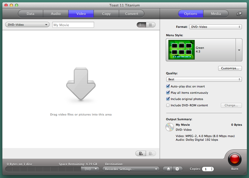 Toast Titanium操作简单易上手,对于新手来说无需查看任何Help,将文件拖入左部窗口,点击“Burn”即刻开始刻录,另外Toast Titanium还支持多光驱同时刻录。