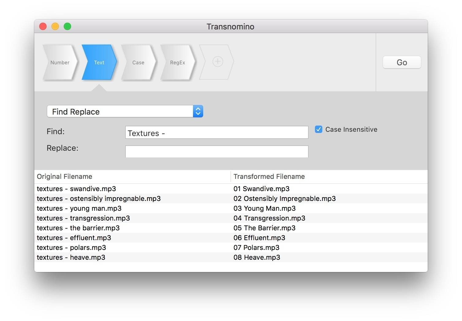 Transnomino offers a set of renaming actions, ranging from simple text replacements to more complex replacements using regular expressions (regex). Any number of these actions can be placed in sequence and you can directly preview the results while you create them. Renaming sequences can be saved as a recipe to be re-used later. Numbering can be added to the beginning or end of the filename. It's possible to exactly specify the number of digits to allow for better sorting of the files by filename. The files in the list can be dragged and dropped to change the order. Features Simple find / replace Case changes, such as upper/lower-case and capitalize all uppercase all lowercase capitalize each word capitalize first word of the filename Numbering Regular expressions Note: While the software is classified as free, it is actually donationware. Please consider making a donation to help support development.