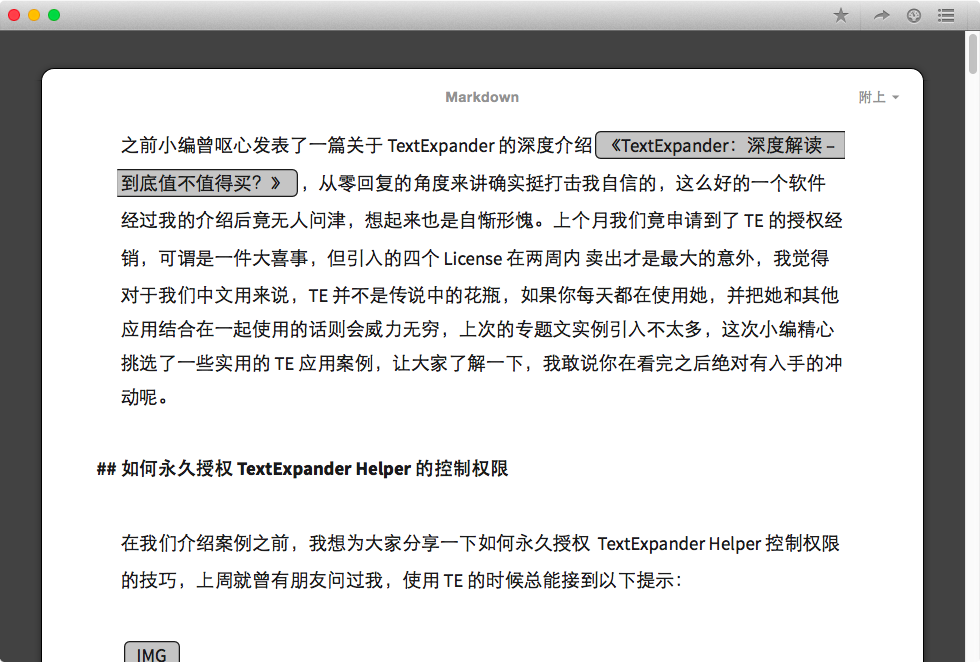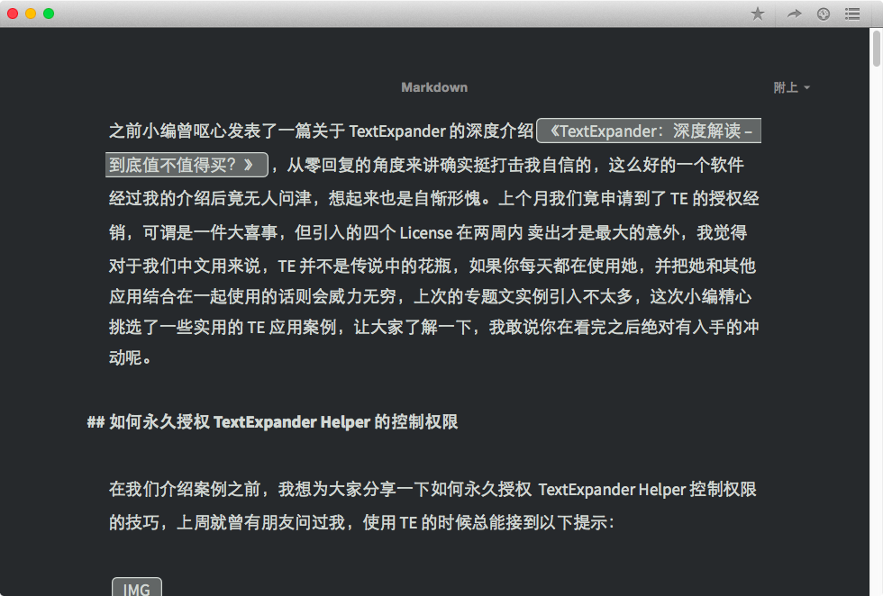 和 Byword, Mou 等写作软件一样,Ulysses 也提供了「黑色主题」与「白色主题」两种配色界面,你可以根据个人口味在「浏览」菜单内随时切换,一般「黑暗主题」比较适合光线不太重复的情况下使用,这样不易于让眼睛疲劳,同时,你还可以打开「Paged Mode」来切换到模仿纸张外形的模式里写作,官方本地化界面里翻译为「分页模式」其实不妥,因为「Paged Mode」并不能根据段落自动分割出单页面,所以翻译为「纸张模式」更妥当。