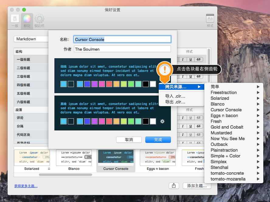 在重新定义一个主题的时候,你可以修改主题的名称,作者名,当然,你最好修改完成之后再动这些信息,下方的两个颜色面板都可以调用 OS X 默认的调色版(点击每一个样本方块即可),一般前两个方块代表正文的「背景色」和「段落正文颜色」。