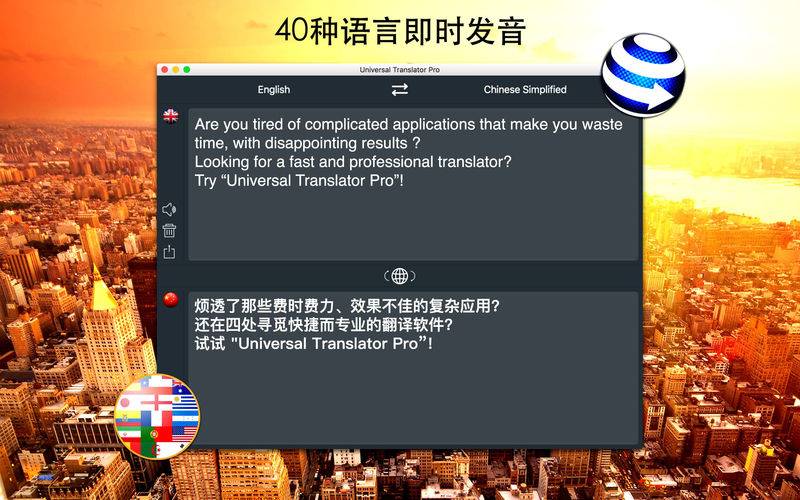 烦透了那些费时费力、效果不佳的复杂应用? 还在四处寻觅快捷而专业的翻译软件? 试试 "Universal Translator Pro”! 这个精密而强大的翻译和语音识别系统能让你将书写或听写的句子后快速译成40种语言。 若你需要听到译文的发音,没问题! “Universal Translator Pro" 也有出色的内置语音合成器。