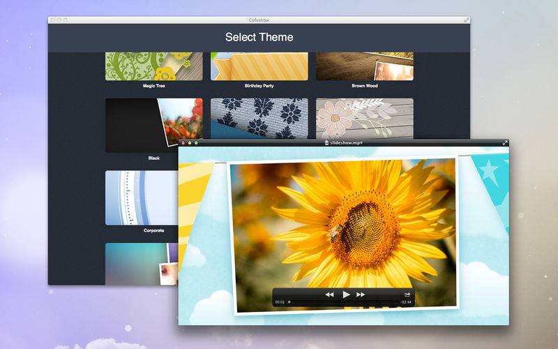 Video slideshow maker with pack of ready to use themes: slides duration and transitions will be set automatically, Full HD quality. Create awesome video slideshows in few clicks with professional Full HD quality themes. Just select photos and music you like - everything else you need is already prepared and ready to produce best result. Our best slideshow themes are: - Magic tree - great theme for holiday slideshow: reach colors and great animation. - Birthday party - nice theme for child birthday or holiday video. - Dark wood - stylish nature slideshow theme with wooden background. - Simple slideshow - is classic video slideshow theme with black background and fade in fade out transitions. - Blue denim theme is perfect for Love story slideshow. - Vanilla theme fits great for romantic videos, it has lovely animated flowers and perfect design. - Corporate style if for presentation and advertise videos - strict but dynamic design will helps you to promote your product or presentation. - Baby theme name talks for it self - lots of cartoon animation and elements to make merry laughter. - Pan and zoom video theme - is classic slideshow effect prepared for use, just add you nice photos. - Blurry video theme - Calm and soft video slideshow with colorfull blurry background. - Roller slideshow effect - Classic photos transition roller effect. - Watercolor animated theme - Nice light slideshow watercolor background with calm drawing animation.