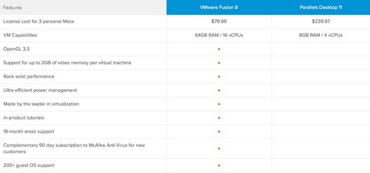 VMWare Fusion 8 与 Parallels Desktop 11 的功能对比
