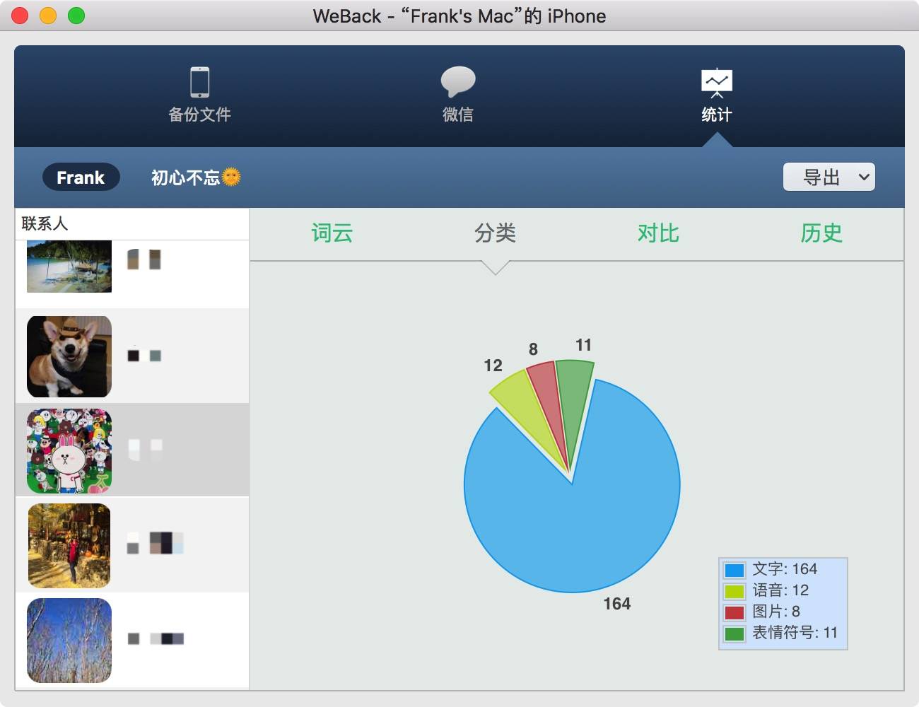 同时,与好友的聊天记录还可采用形式多样的统计功能,分辨出你与好友聊天时语音,文字及图片的占用比例,过去几个月是如何互动的,或者群里谁最能聊,这些数据都能一目了然的获取。你可以通过“词云”、“柱状图”、“饼图”这些图表进行查看。