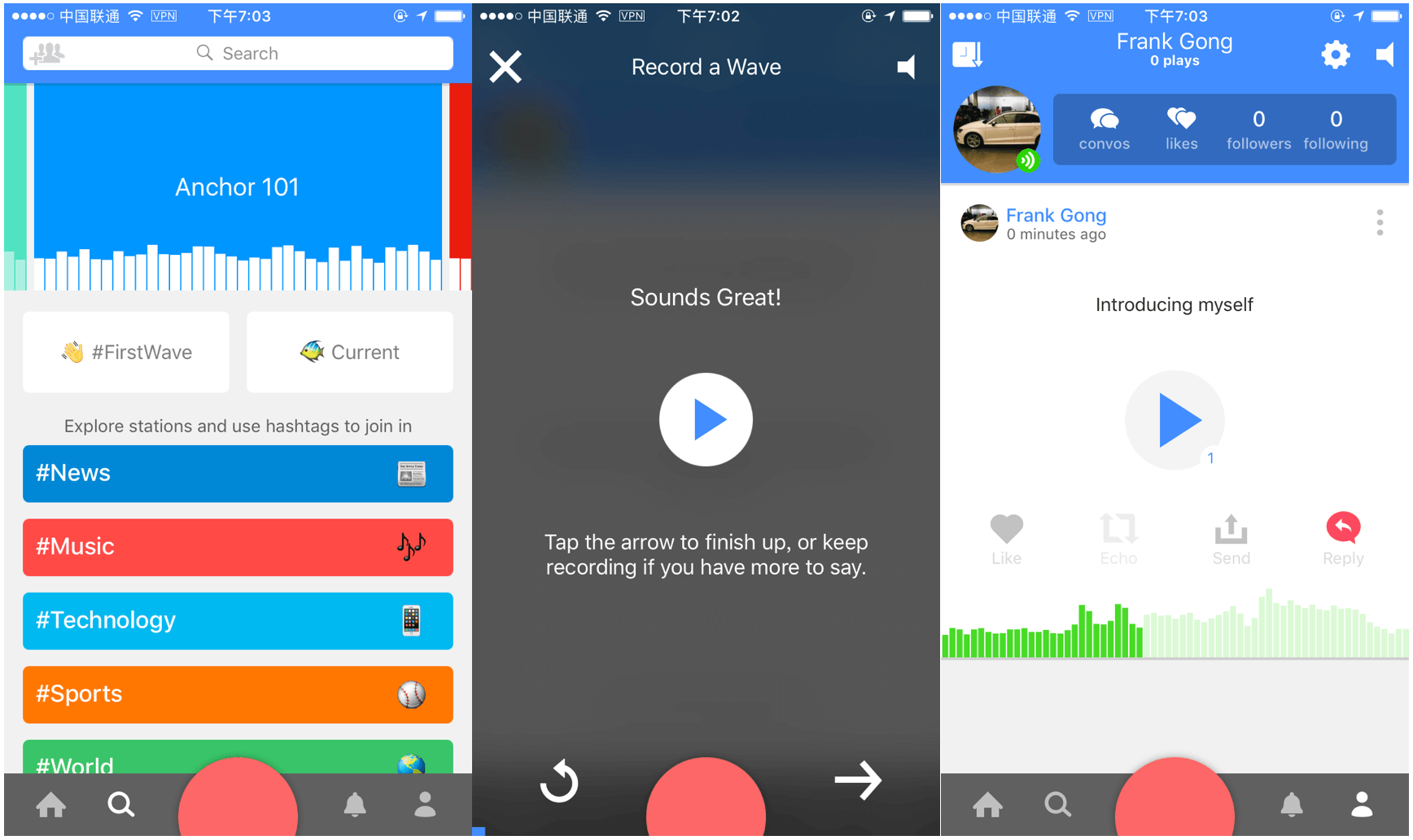 传统的 Podcast 运作方式都是几个 DJ 在线下用软件录好后进行后期编辑再上传到播客网络进行传播,也就是说一期节目从制作到上线,她的周期可能会是1-2天,甚至是更长。而 Anchor 的诞生则打破了这个传统思维,这款应用可以让每位用户随时随地通过手机录制任意长度的语音记录,然后即时上传到互联网,利用社交那套玩意儿进行传播。