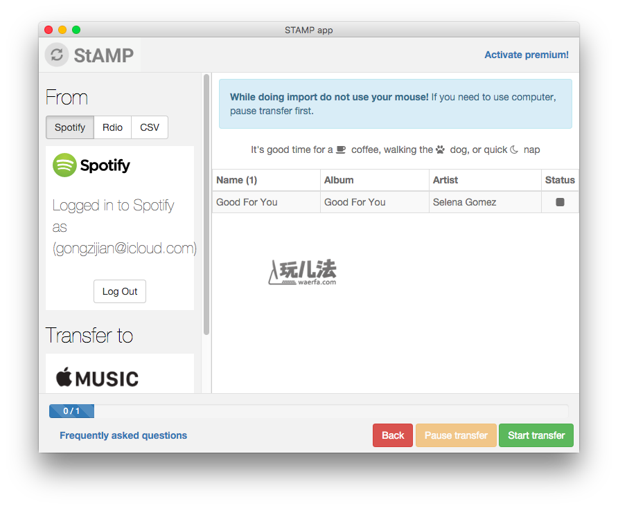 这款软件能通过将 Spotify 和 Rdio 上的音乐通过 Playlist 导入 Apple Music,比如 Spotify,操作之前需要你到 Exportify 将你收藏的音乐项或 Playlist 导出成 CSV 格式文件,然后导入到 STAMP 上,或者直接在 STAMP 里登录 Spotify/Rdio 的账户,他会自动扫描你的歌单,别忘了打开 iTunes 登录 Apple Music,后面的事就交给 STAMP 吧,他能将导入的歌曲信息自动在 Apple Music 上匹配并记录在你的账户内。