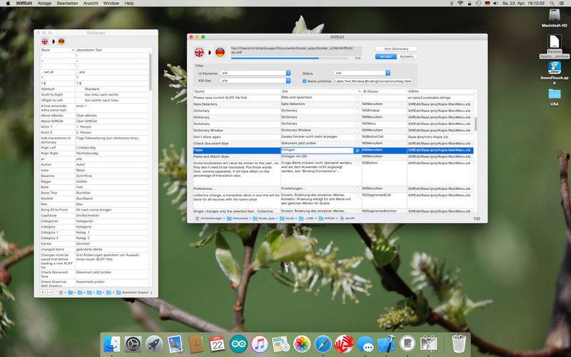 XliffEdit let you manage the translation of your multi-lingual apps in a convenient way. Prerequisite is to export XLIFF files from your project with Xcode. XliffEdit is taking this information and presents all terms that can be translated in a transparent way. Translations can be done collectively for one word or phrase throughout your xcode project, or even translate from a personal dictionary.