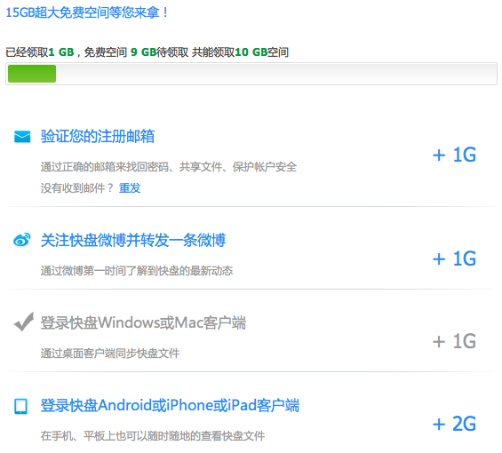 默认空间6GB,还算厚道,如果验证邮箱,发微博,邀请好友加入,使用各种客户端还能再拿10GB空间。