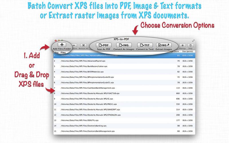 ◆ Very flexible options to add XPS files into conversion list. Simply Drag & Drop into list or Right click Open With in Finder or Drop on "XPS-to-PDF" application to add files for export beside direct Add File/Folder buttons.