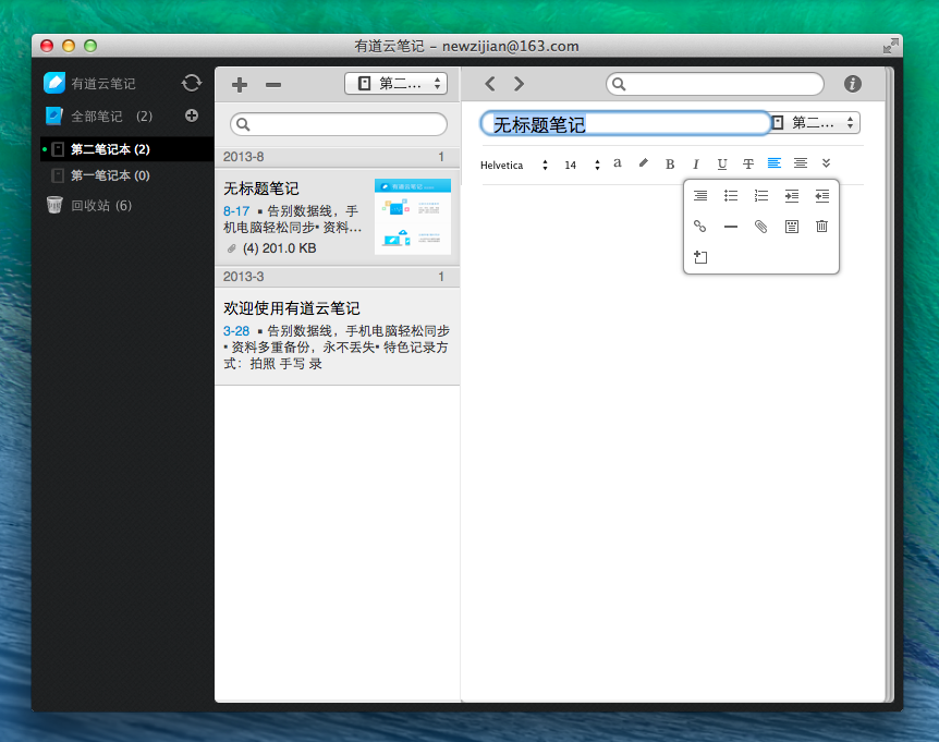 有道云笔记团队自今年6月底向媒体透露Mac客户端即将推出后,产品的真身终于来到了我们的面前,本次我们获得的是内测版,整体功能和其他平台保持一致,登录网易统一账号即可同步云数据到本地,在内容编辑功能上除了基础的文本操作功能外,还支持上传本地文件,插入外链,表格等功能。